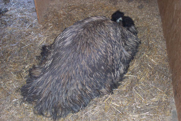 Einer unserer Emuhähne beim Brüten. Bei Emus übernimmt die Brutpflege komplett der Hahn. Für die Henne hat sich